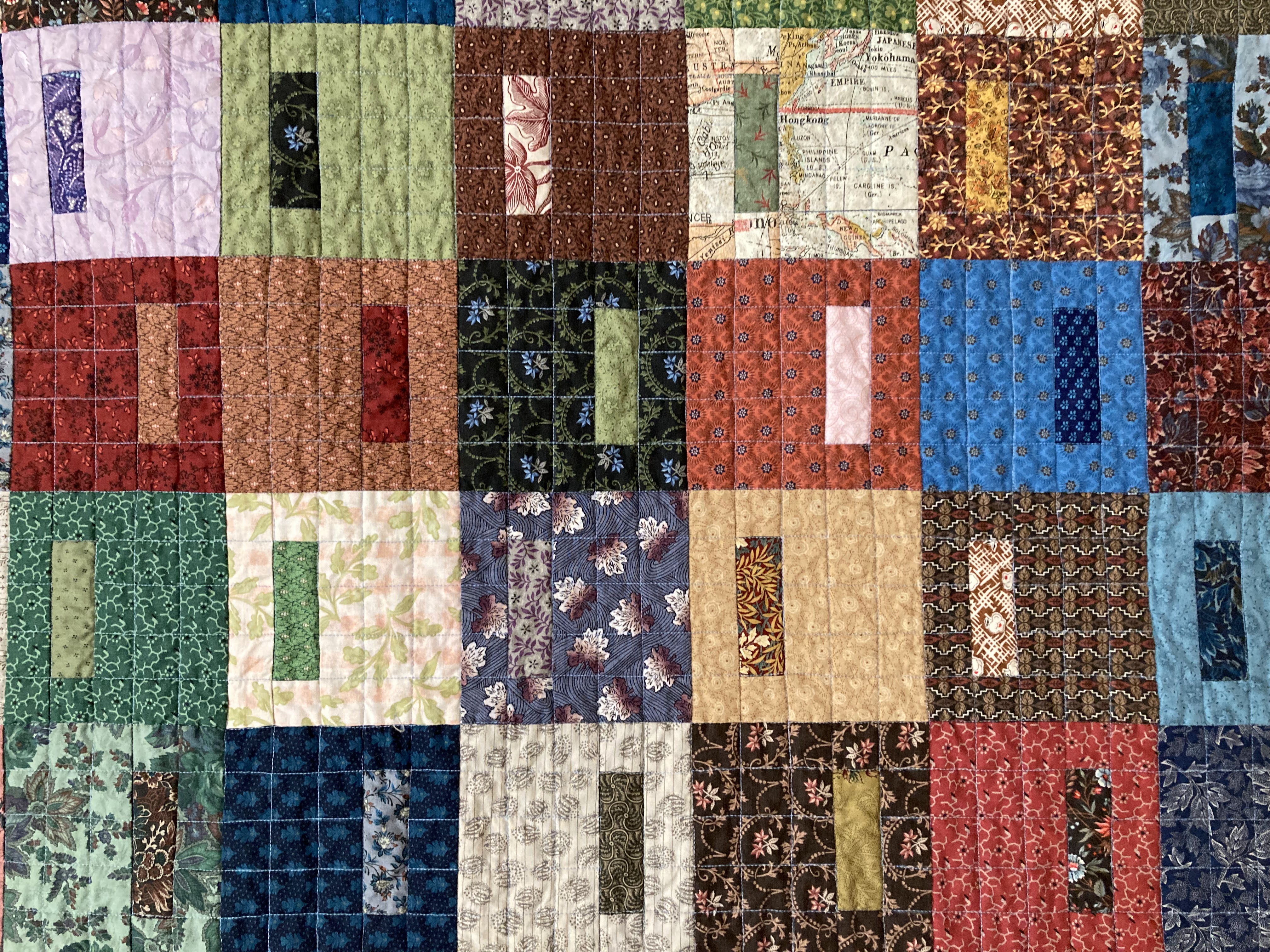 I still working (off/on) to improve my free motion machine quilting. I have trouble keeping the stitch length even. This small lap quilt was made using small practice pieces. Finished size approx 32 in x 48 in. I gifted it to a friend in December who was going through chemotherapy for multiple myeloma. He died earlier this year from complications.